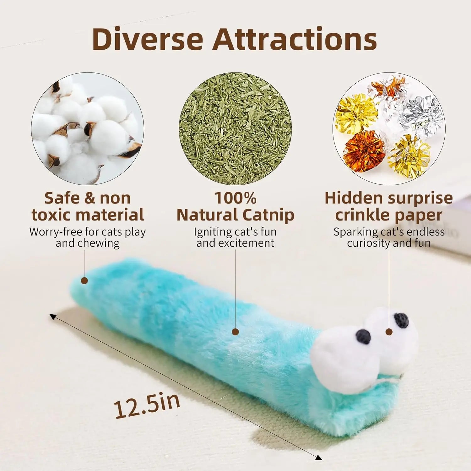 Cute caterpillar-shaped:This cat toy designed with big, expressive eyes and soft, fluffy fur, providing a playful experience for your cat. It’s like they’re frolicking in the grass, pouncing on a caterpillar, sparking endless fun.