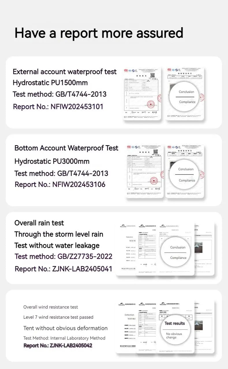 Outer Tent Fabric: 15D Tear-resistant Fine Grid Nylon Single Silicon Waterproof PU1500mm+Bottom Tent Fabric: 20D Tear-resistant Double-line Grid Nylon Single Silicon Waterproof PU3000mm+