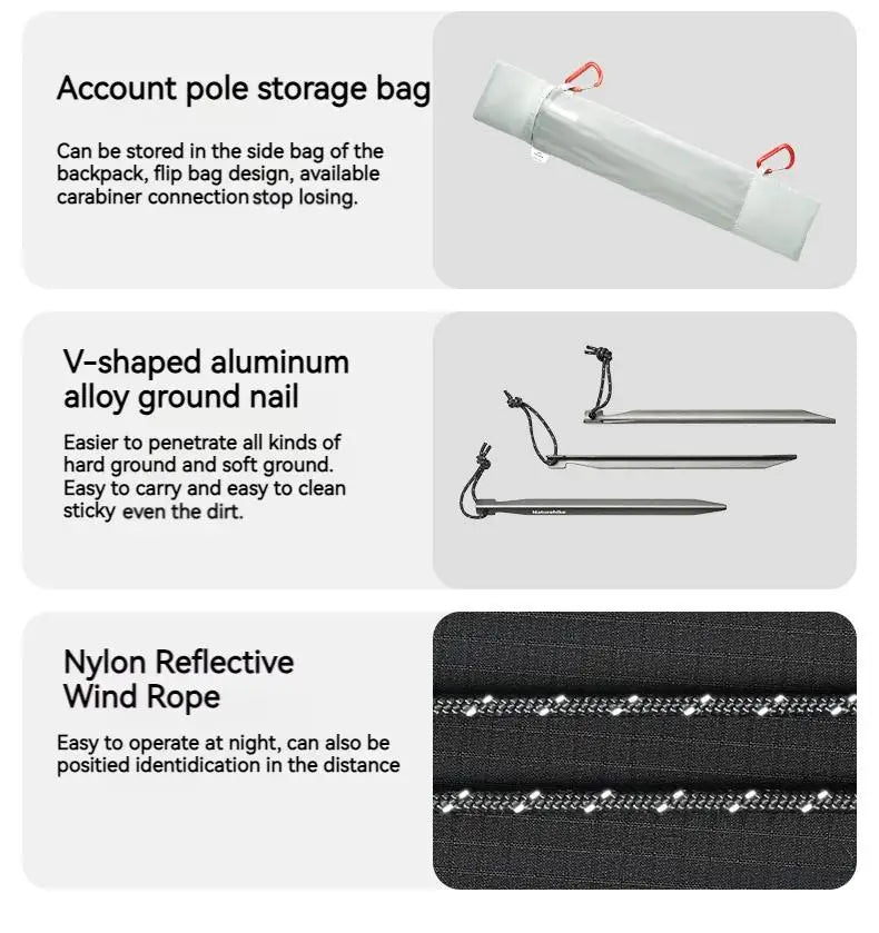 Ground Nail Material: 15cm High-strength Aluminum Alloy V-shaped Ground Nail x14 Wind Rope Material: 2mm High-strength Nylon Reflective Wind Rope x6
