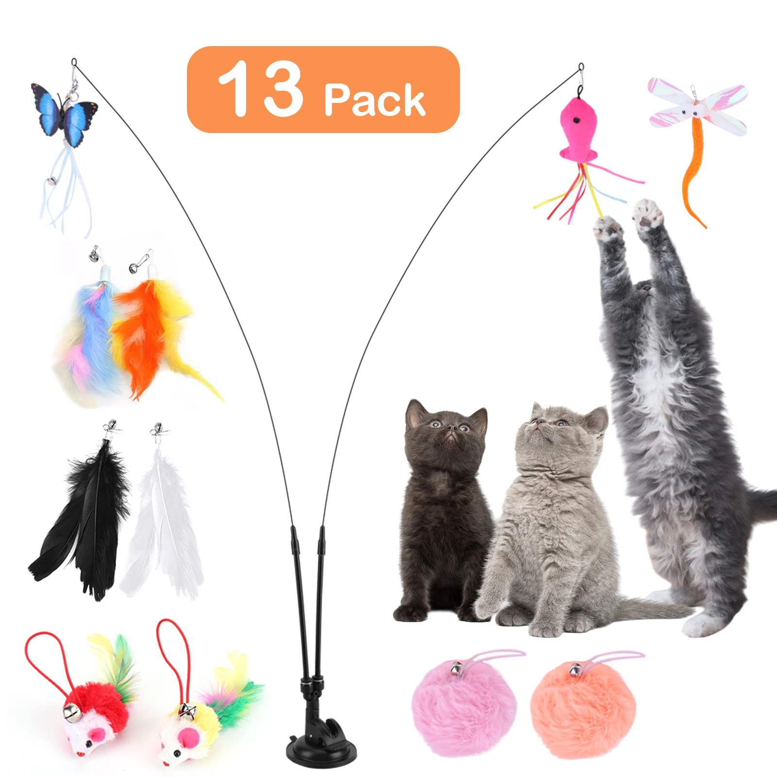 1.Cat Toy Set: Includes 13 interactive for replacement head toy suit, offering a variety of play options to keep your feline entertained with a diverse range of handfree cat toy stick.